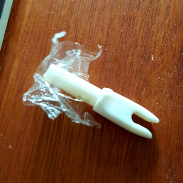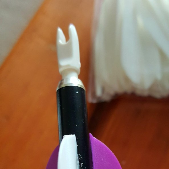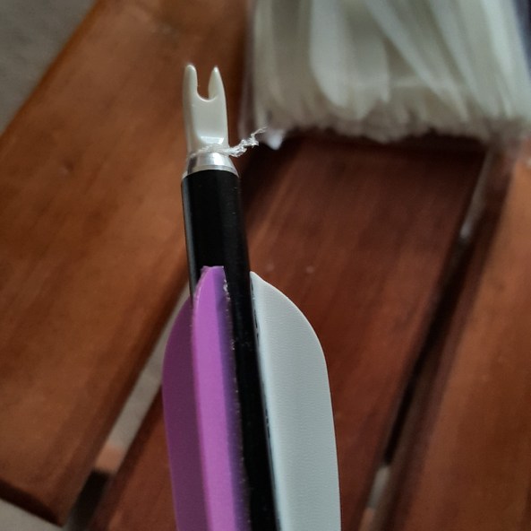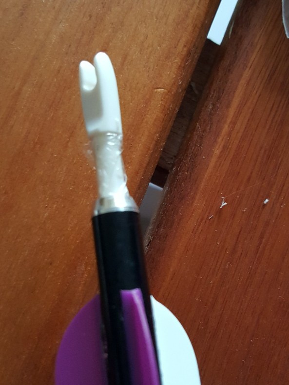 When making them I noticed the nock tends to rotate in the shaft, making it a bit tricky at times when mounting them on the fletching jig. Now you could add a drop of glue to secure them, but Steve suggested using cling film. Yes, the stuff that normally covers your supermarket produce.