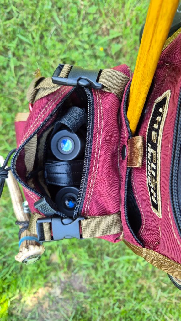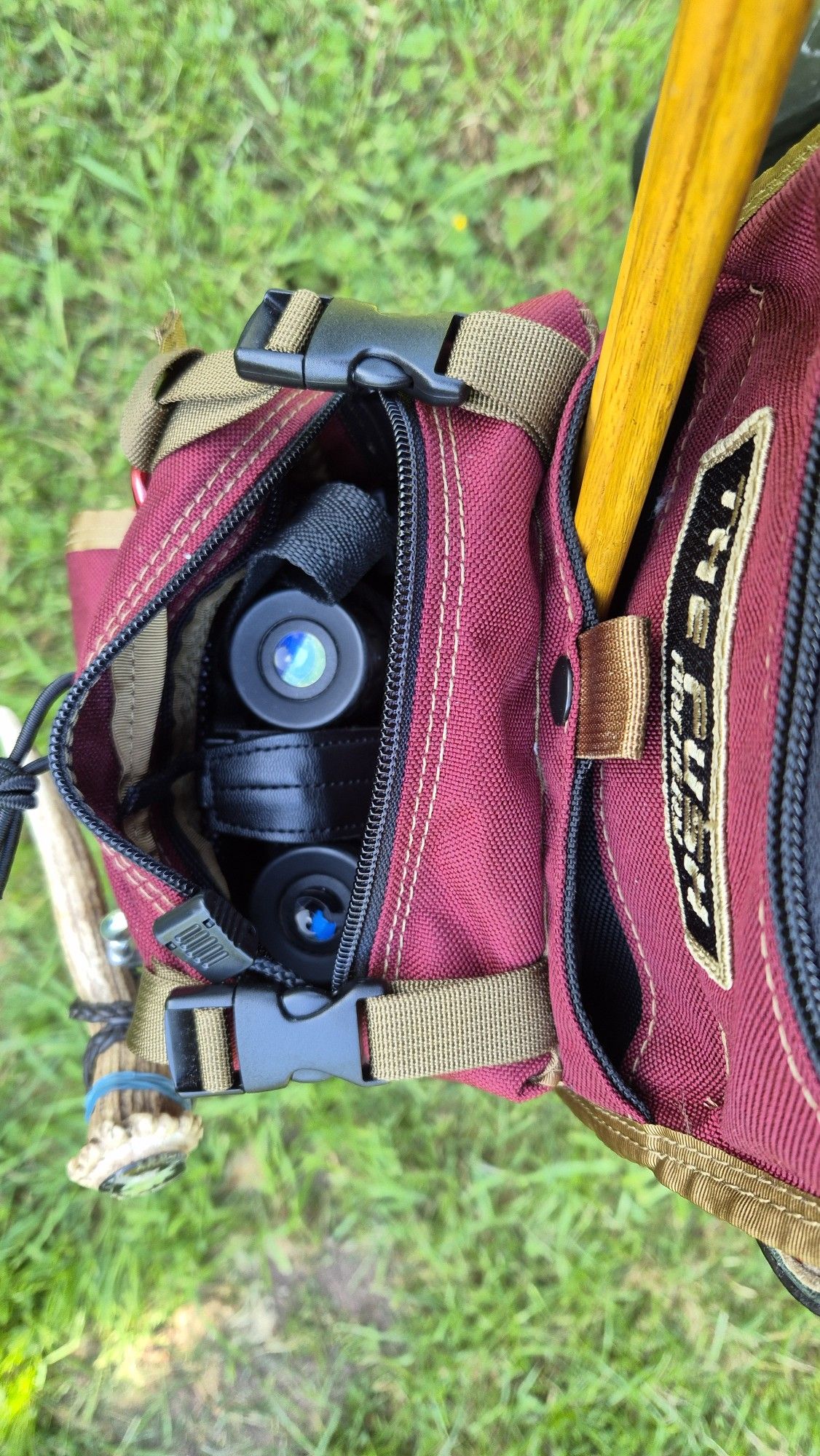 One thing I have taken to do is leaving the quiver open slightly so I can easily reach in and grab the binoculars if I need them. To ensure the zip doesn’t accidentally open further, I’ve looped the cord loops through the pack’s top straps. This prevents the zip moving.
